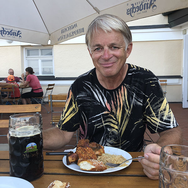 Kloster Andechs: Eine Maß Dunkelbier mit einer 1/2 Schweinshaxe mit einer Riesenbrezel war unser leichtes Abendessen