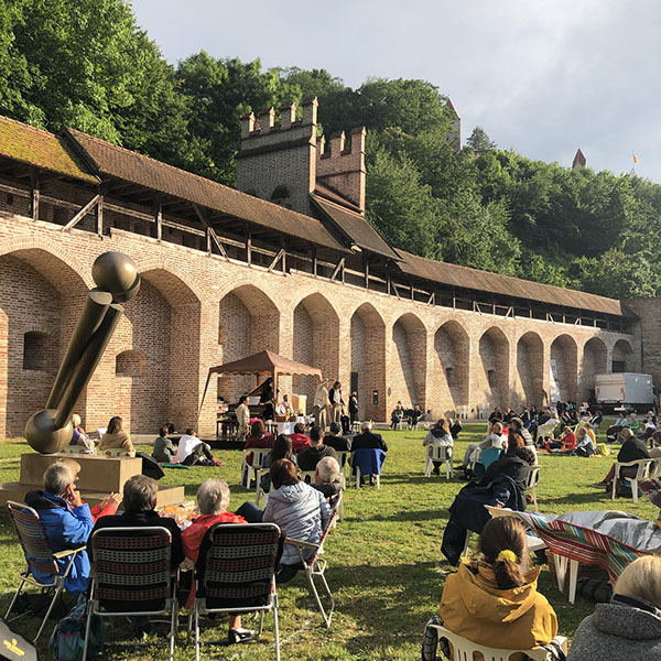 Camping verlassen, auf dem nächsten P entsorgt im Gulli. Fahrt auf dem großen P in Landshut. Mittaggessen beim Delikatessen-Laden oben im Restaurant ( €, lecker). Dann noch ein Cappuccino bei der Gerbel Bäckerei Konditorei + Brezel und Brot gekauft. Julia noch bei Karstadt neuen Geldbeutel gekauft. Um 17 Uhr los zum The Picknick in dem Prankelgarten. Sehr nett und lustig, insbesondere als die Kirchenglocken läuteten während eine Arie von La Traviata gesungen wurde. Und als es anfing zu regnen, musste der Flügel abgedeckt werden... aber der Regen hat nur 6-7 Minuten gedauert. Am großen Parkplatz entlang der Isar geparkt.