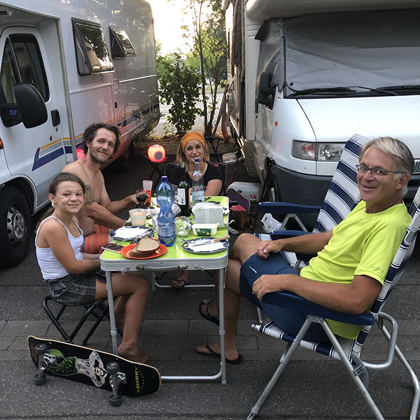 Nach dem Mittagessen Fahrt Richtung Ettlingen. Auf der Fahrt auf der Autobahn ist der innere Reifen hinten rechts geplatzt. Wir mussten 1:45 Stunde warten, bis eine Hilfe vom ADAC kam. Wir mussten 413 Euro für den Wechsel des Refens bar bezahlen. Gott sei Dank war der Helfer Herr Bettendorf von der Firma Höhl aus Ludwigshafen sehr nett. Nach 3 Stunden konnten wir weiterfahren und sind bis Ettlingen gefahren. Da haben wir noch Glück gehaft, einen Platz neben sehr nette Marseillais bekommen zu haben (sie haben alles verschoben, damit wir noch reinkamen). Mit den haben wir dann eine Flasche Rotwein mit verschiedenen Käsen verspeist. N48º56'11" E8º25'3"