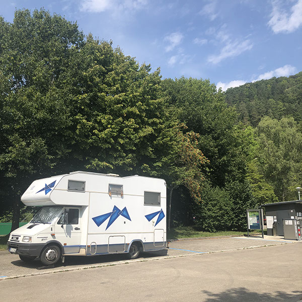 Fahrt nach Blaubeuren. Haben da einen sehr schönen Stellplatz beim Sportheim bzw. Freibad erhalten (18€ mit Strom für 2 Nächte inkl. 1 Eingang zum Freibad). Am Eingang von Blaubeuren haben wir einen Bike-Shop "Bike Station" gefunden und sofort Volkers platten Reifen abgegeben zum Schlauchwechseln. Auch haben wir noch Abendessen bei Norma gekauft. Nachdem er den Reifen abgeholt hat, haben wir nur noch gechillt. Nº48.4152237 E9.7912028º