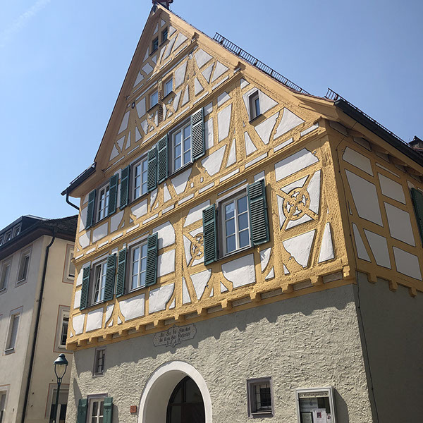 Blaubeuren beim Blautopf. Die Kirche, die zum Kloster gehört, hat ein prägnantes Dach mit gelb-grünen Mosaiken