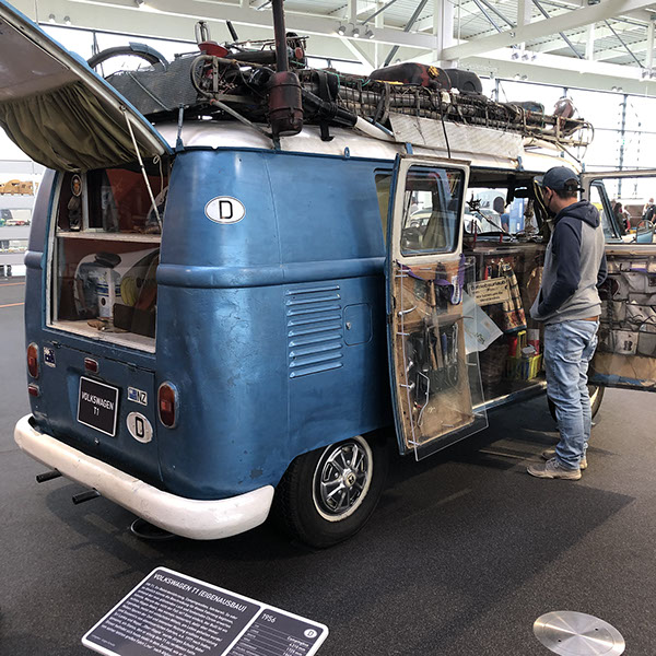 Ein authentisches Hippie-VW-Bus im Hymer Caravan Museum, Bad Waldsee