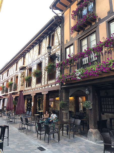 Fahrt nach Dax, wo wir noch gut bei Mercadona Schinken gekauft haben. Danach Fahrt nach Logroño, wo wir am großen schattigen Parkplatz bei dem Schwimmbad geparkt haben. Zu Fuß in die Innenstadt, zur Info und dann Mittagessen im ersten Restaurant "El Comienzo" (sehr gut, nur 30€ mit allem: Couvert, Vorspeise, Hauptspeise, Nachspeise, großes Mineralwasser, 1 flasche Rotwein!). Danach noch einen Kaffee in der Calle Portales (2,50€), Julia einen Llaollao-Eis, dann zum Wohni. Man muss ja in Spanien überall Maske tragen, also auch auf der Straße, wenn man spaziert. Besuch des Geschäfts des ältesten Weinguts in Logroño: Franco Español, aber nichts gekauft. Wir entschieden uns dann nach Westen zu fahren, nach Ezcaray, um morgen eine Fahrradtour auf der Via Verde Ezcaray-Haro zu machen. Obwohl wir erst keine Lust mehr hatten wegen der Hitze, sind wir doch noch mit unseren Fahrrädern in die Altstadt gefahren, die wirklich sehr nett ist. Bei der Bar Satorre haben wir einen Getränk eingenommen, sind noch zu Fuß ein wenig durch die sympatische Kleinstadt (nur 2.000 Einwohner) mit vielen Bars und Restaurants gelaufen, bevor wir um 20 Uhr nach Hause gefahren sind. N42º19'39" E3º0'34"