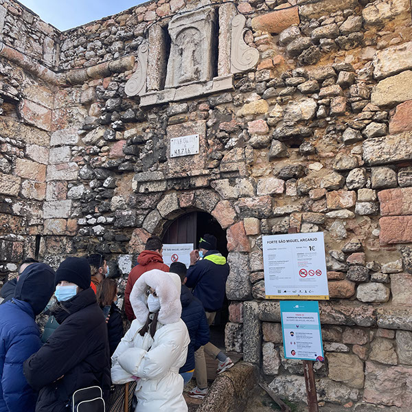 Ein kalter Wind und manchmal Regen, alle waren dick eingepackt. Hier am Eingang vo Forte de Nazaré