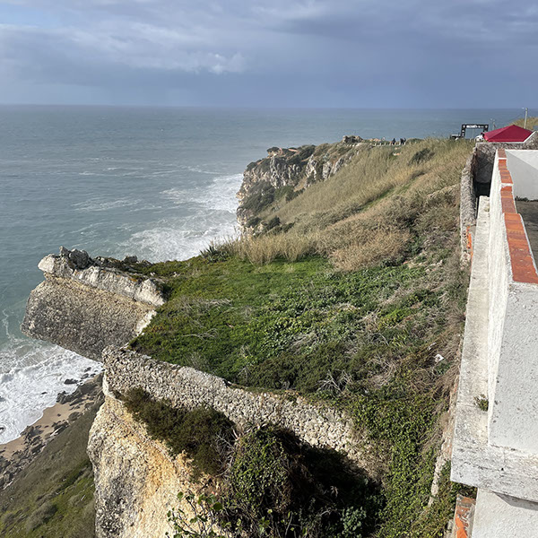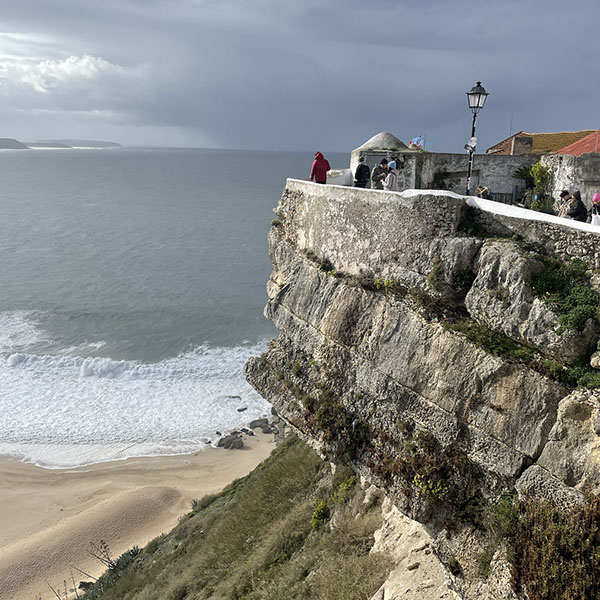 Blick hoch auf den Felsen von Nazaré. Der Fort liegt links am tieferen Ende