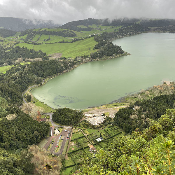 Blick vom Miradouro Pico do Ferro. Unten sieht man das Gelände mit den Fumarolas und die Lagoa das Furnas