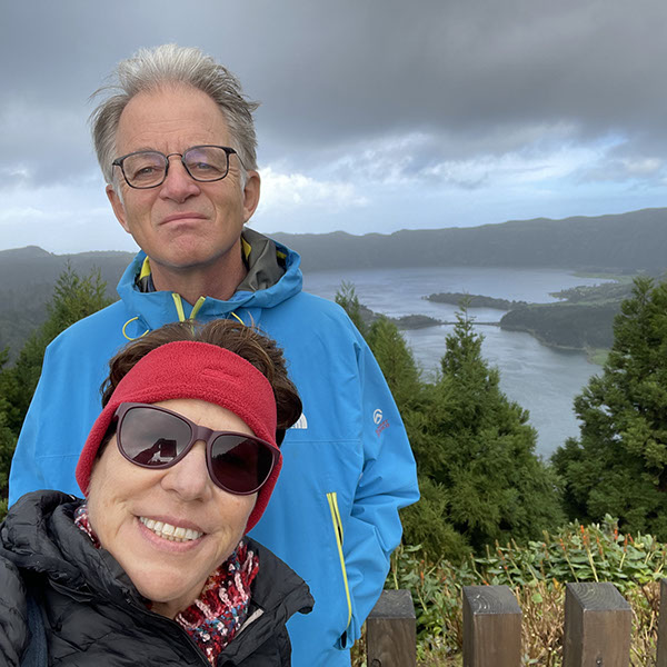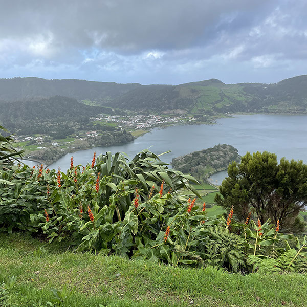 Oben auf dem Miradouro da Vista do Rei mit Blick auf Lagoa Verde, Lagoa Azul und Sete Cidades.