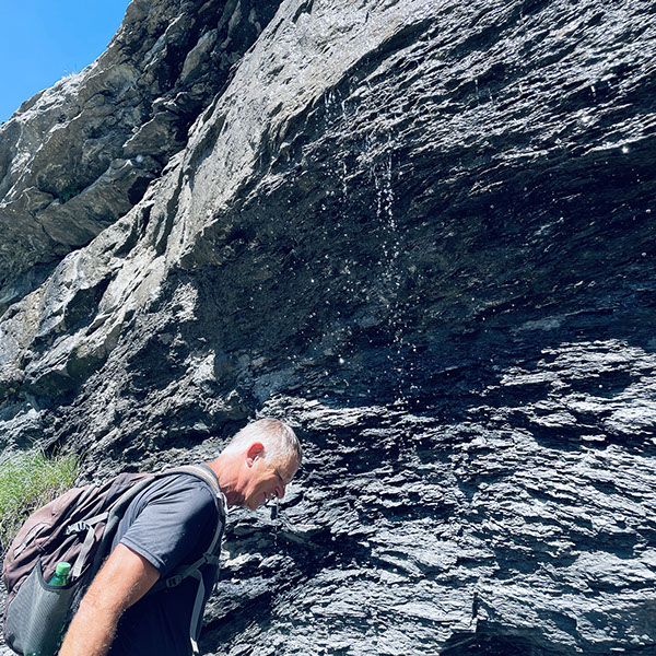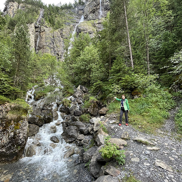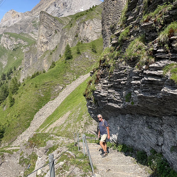 Kandersteg: Wanderung am Oeschinensee - Volker "duscht" an einen der vielen Wasserfällen