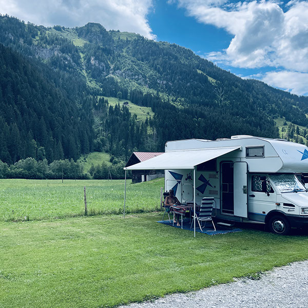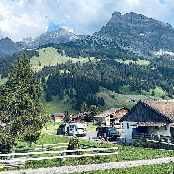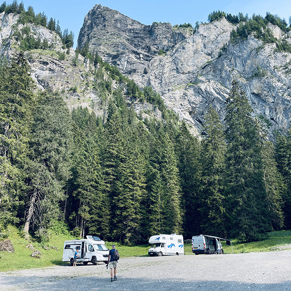 Adelboden: unser Stellplatz am Wendeplatz, Schlössli-Platz in Boden. Wir blicken auf die Engstligen-Fällen