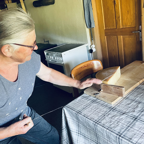 Käserei von Familie Wäfler auf Alp Hahnenmoos: hier schneidet die Oma den Käse mit einem ganz tollen selbst gebasteltem Gerät
