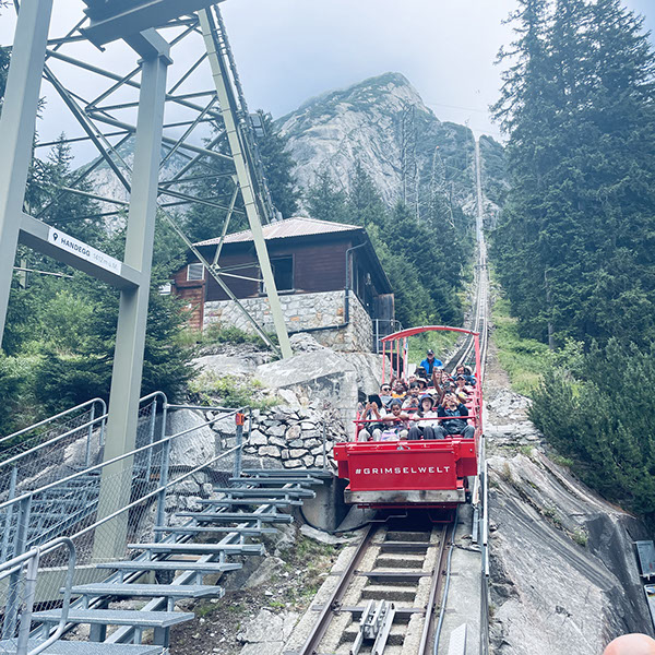 Die Schienen von der Gelmerbahn von dem Handegg Hotel gesehen - ganz schön steil! Ratternd und rückwärts geht’s mit der Gelmerbahn in 10 Minuten hinauf zum türkisfarbenen Bergsee.