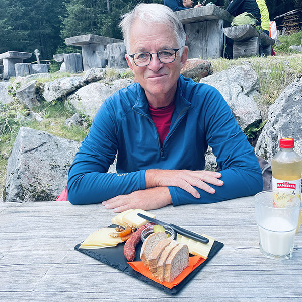 Eine Käse und Wurstplatte bei der Käserei Handegg mit frischer Milch als Snack bevor wir mit der Gelmerbahn hoch konnten