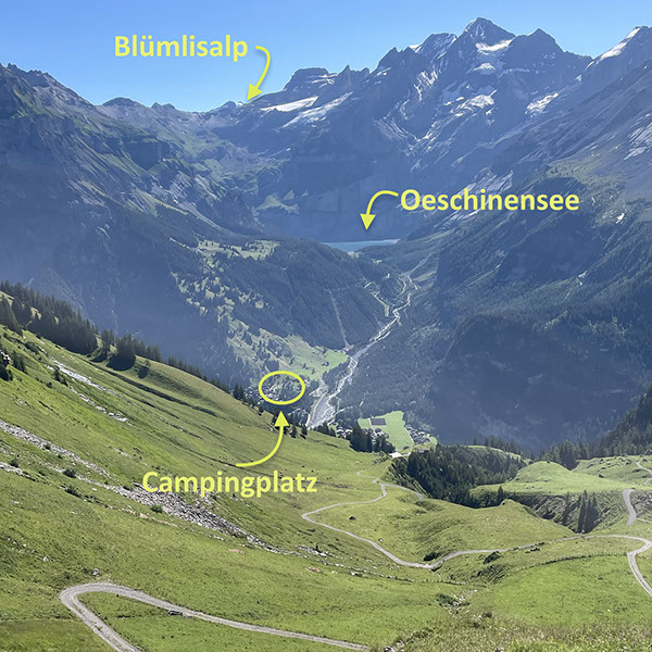Kandersteg mit dem Oeschinensee, den Campingplatz unten links