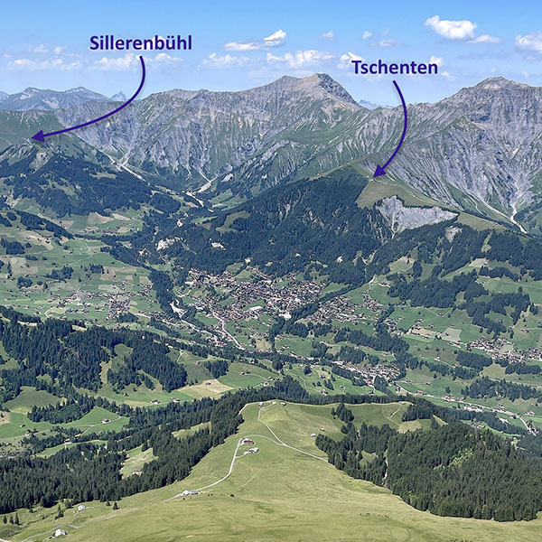 Leiterli-Stübleni bzw. Grydde-Wanderung. Lenk von der Betelberg-gondelbahn gesehen. Rechts hinten sieht man die Simmenfällen und davor unser Campingplatz