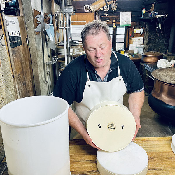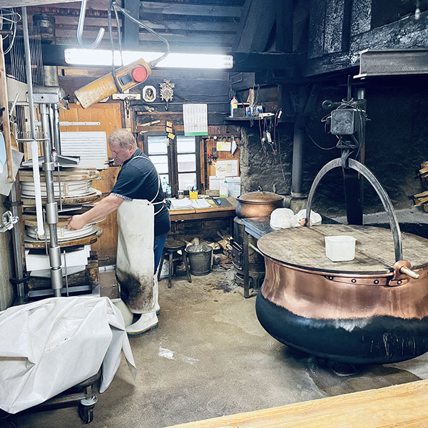 Der Käser bei der Käserei Fromagerie d'Alpage de Moléson zeigt uns wie ein Käselaib gepresst wird. Man beachte den großen Kupferkessel rechts
