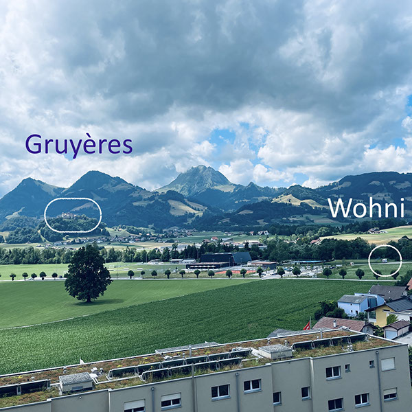Blick aus dem Restaurant Les Montagnards in Broc: Gruyères links und unser Wohni rechts