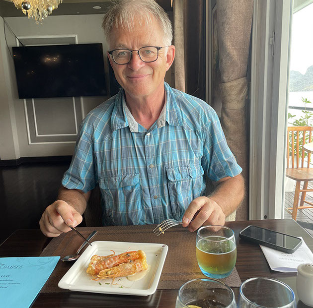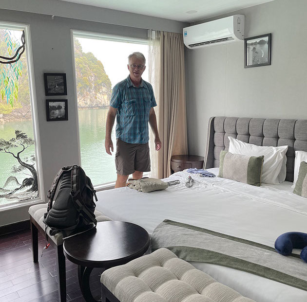 Aufstehen um 5:30 Uhr! Kaffeetrinken um 6:00 Uhr und Fahrt um 6:40 zu einer Cave, eigentlich einem Tunnel, wo wir durchgefahren sind. Um 9:00 Uhr gab es dann einen Brunch, den ich voll genossen habe. Um 10:30 Uhr werden wir auschecken. Fahrt mit dem Tender zurück nach Halong, wo schon Ctian und der Fahrer Vuong auf uns warteten. Fahrt von Lan Ha Bay nach Ninh Binh (4 Stunden). Emeralda Ninh Binh Resort & Spa.