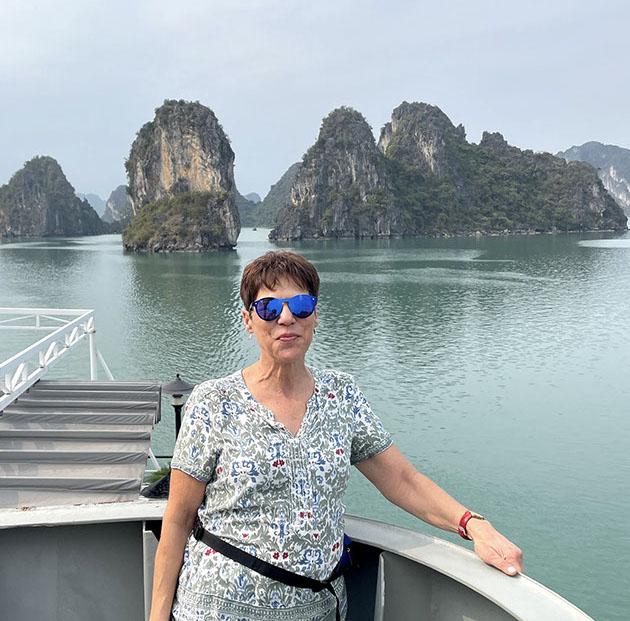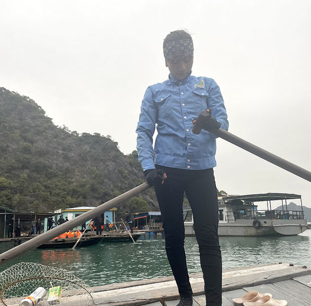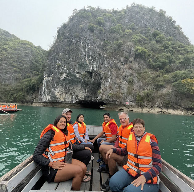 Zweistündige Fahrt nach Halong. Dort konnten wir im allgemeinen Touristen-Rummel die Produktion von Perlen anschauen. Und natürlich hätte ich auch in dem riesigen Geschäft etwas kaufen können. Um 12:15 Uhr Abfahrt mit dem "Tender" zu unserem Schiff Era Cruises. Die Fahrt dauert ca. 45 Minuten. Wir wurden sehr nett empfangen. Es gab zuerst Mittagessen, wir bekamen die Terrace Suite T6 auf der Era Cruises, herrlich schön, riesig, mit Terrasse und tollen großen Fenster! Um 15:15 Uhr sind wir mit Kajaks jeweils zu zweit zu den Felsen gefahren, wo wir evtl. auch Affen sehen würden; leider haben wir keine gesehen, es hat aber trotzdem Spaß gemacht. Ein wenig auf unserer Terrasse gesessen, dann hoch zur Bar, wo wir von der Happy Hour Gebraucht gemacht haben. Sehr nettes Gespräch mit Australier geführt. Nach dem Abendessen haben wir versucht, Tintenfisch zu angeln, wir haben sie zwar gesehen, aber nicht fangen können -ehrlich gesagt, wollen wir das auch garnicht. Wir müssen früh zu Bett, denn morgen fängt der Tag um 6 Uhr an!