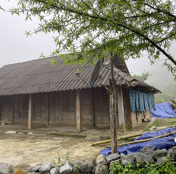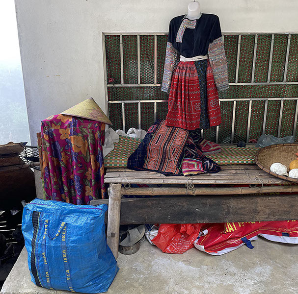 H´Mong Haus. Auf der Seite gefärbte indigo Tücher
