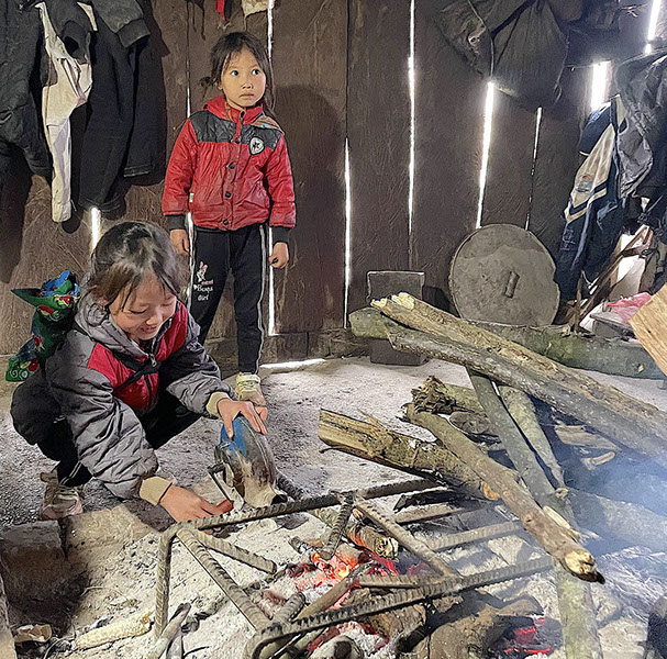 Das älteste Enkelkind fächert das Feuer mit einem Spezialgerät an