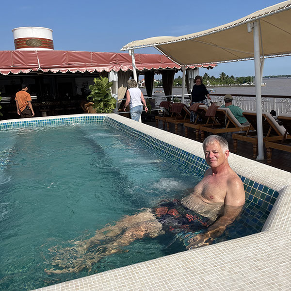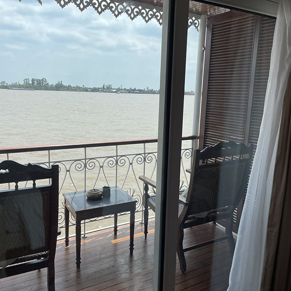Fahrt von Ho Chi Minh City/Saigon nach My Tho (2 Stunden). Auf das Schiff The Jahan Cruise. Gleich ein Drink bekommen. Suite 107, dann Super-Buffet Mittagessen. 15 Uhr Erklärungen. Julia 16:30 Uhr gute Massage (990 K VDN = 39€). Alle nicht-alkoholische Getränke sind jederzeit kostenlos! Noch am Pool gelegen. Abends leckeres Menü, Um 21 Uhr Film Doku über Ho Chi Minh, sehr interessant. Völlig müde ins Bett gefallen.