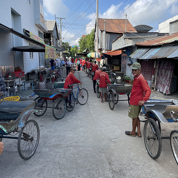 Die letzte Stadt bevor wir in Kambodscha sind: Tan Chau. Hier die "xelois", die auf uns warten, die wir aber erst nach dem Marktbesuch nehmen.
