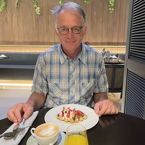 Phnom Penh: hier war das Frühstück mal kein Büffet im Hotel KVL. Wir konnten uns alles von der Karte bestellen. Hier der "Craffle"