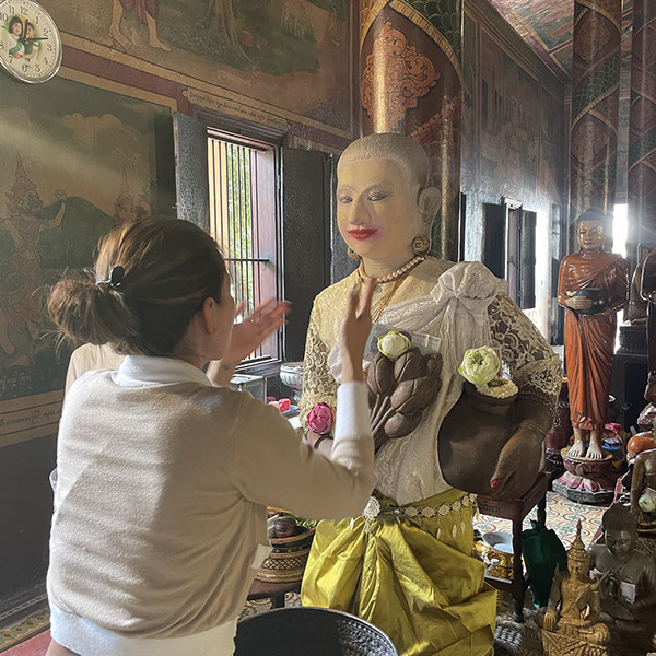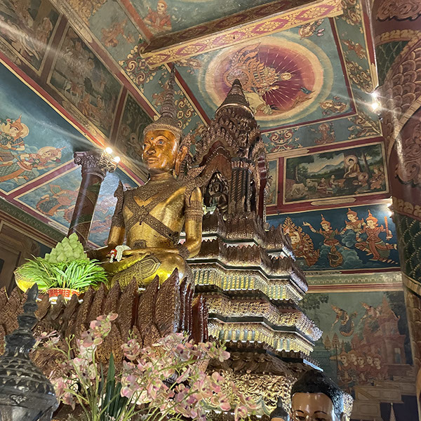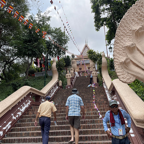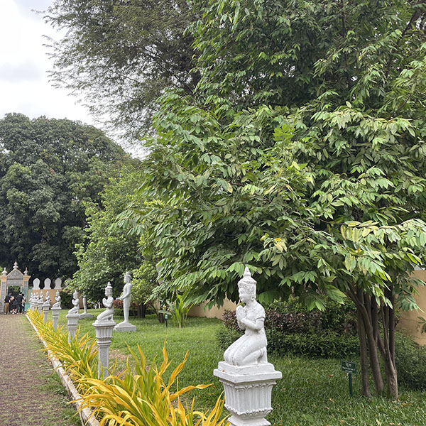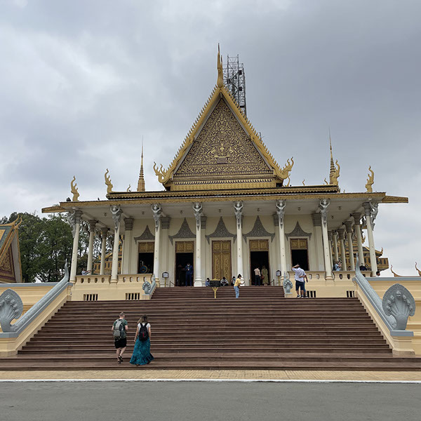 Um 9 Uhr zum beeinruckenen Royal Palace und zur Silver Pagoda (beodes liegen bei uns um die Ecke, aber wir wurden trotzdem da hingefahren). In der Silbernen Pagode befindet sich der Emerald Buddha und der Menschengroßen Buddha aus solidem Gold, dass 90 kg wiegt und mit 2086 Diamanten geschmückt ist. Dann zum Wat Phnom, das auf dem Hügel sitzt mit der Lady Penh, die von Frauen angebetet und geschminkt wird! In den Bäumen sind manchmal Tukane und gegenüber im Baum lauter Fledermäuse! Anschließend zum Nationalmuseum, das 1917 in Khmer Stil von einem französischen Architekt gebaut wurde.