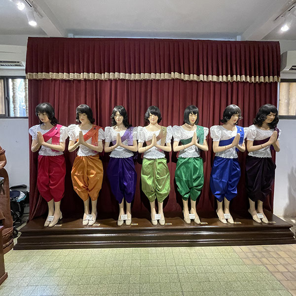 Phnom Penh im Königspalast: Dies sind die Uniformen, die die Bediensteten an den verschiedenen Wochentagen tragen mussten. Jeden Tag eine andere Farbe!